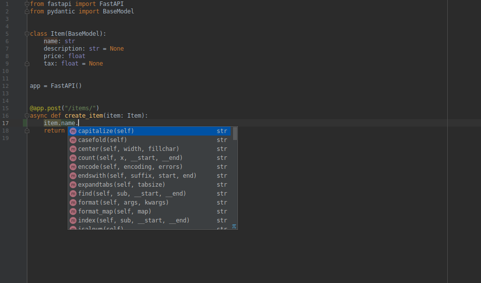 In your editor, inside your function you will get type hints and completion everywhere (this wouldn't happen if you received a dict instead of a Pydantic model):